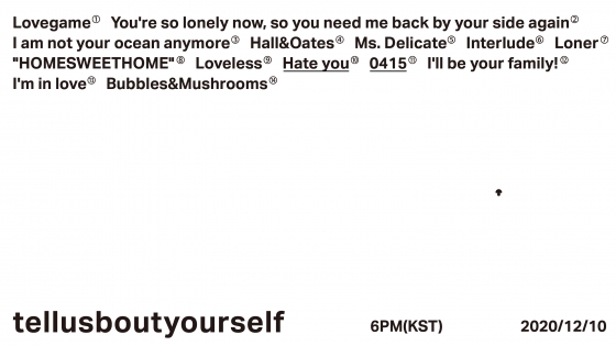 백예린은 1일 소속사 블루바이닐 공식 SNS 채널을 통해 'tellusboutyourself' 트랙리스트를 공개했다. 트랙리스트에는 총 14곡이 수록됐으며 'Hate you', '0415' 2곡이 타이틀 곡으로 포함됐다.