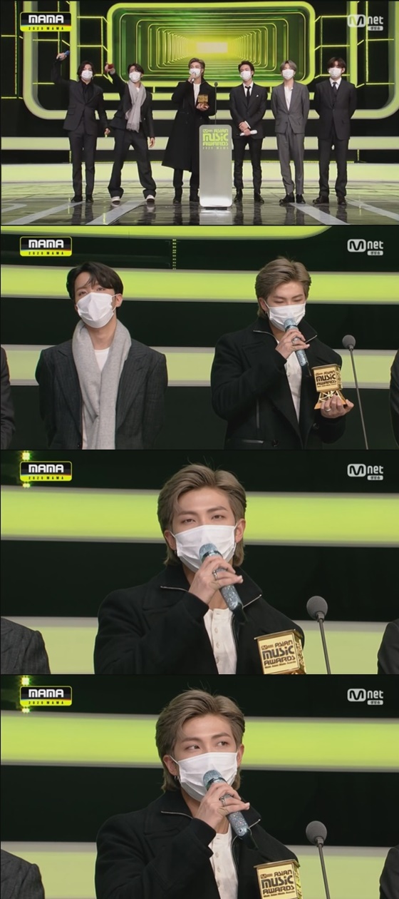 이날 방탄소년단 멤버 RM은 "정말 감사하다. 사실 'MAMA'는 저희가 데뷔 했을 때 초대 받지 못한 시상식이었다. 오고 싶었고, 선망하던 시상식이었는데 시간이 지나다 보니 연속으로 큰 상도 받게 돼 감개무량 하다. 'Dynamite' 이런 비극적인 상황에서 뒷걸음 치다가 천운처럼 만나게 됐고, 이정도로 사랑 받을 줄 몰랐던 곡이다"라고 말했다.