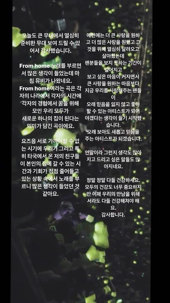 이어 "요즈음 서로 가까이 할 수 없는 시기에 우리가 그리고 특히 타국에서 온 저의 친구들이 본인의 집에 갈 수 있는 시간과 기회가 점점 줄어들고 있는 상황 속에서 노래를 부르니 많은 생각이 들었던 것 같아요"라고 덧붙였다.