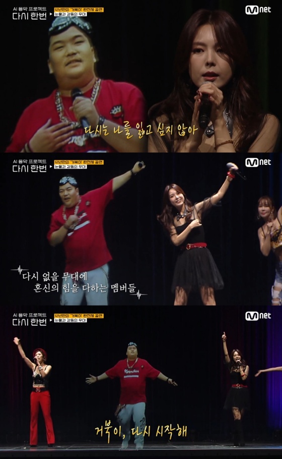 지난 9일 방송된 엠넷 AI음악 프로젝트 '다시 한번'에서는 고(故) 터틀맨의 모습을 복원, 12년 만에 완전체 무대를 가진 거북이의 모습이 공개됐다.
