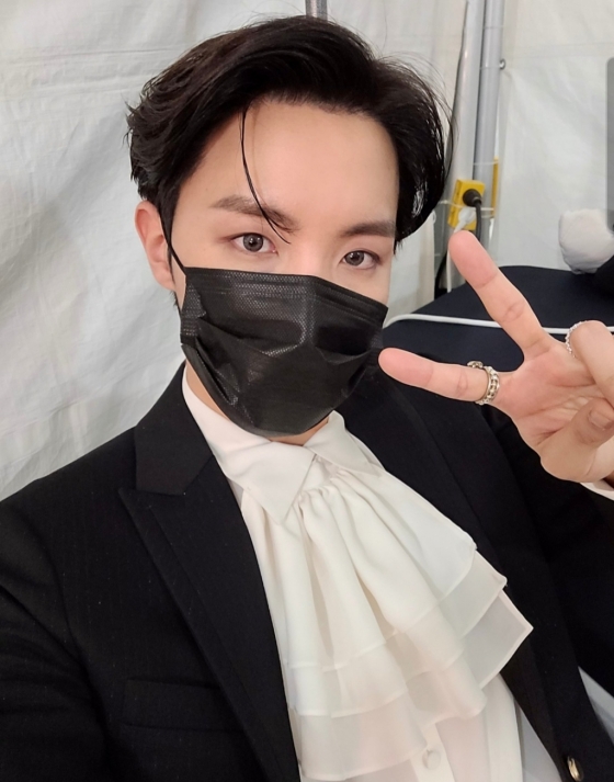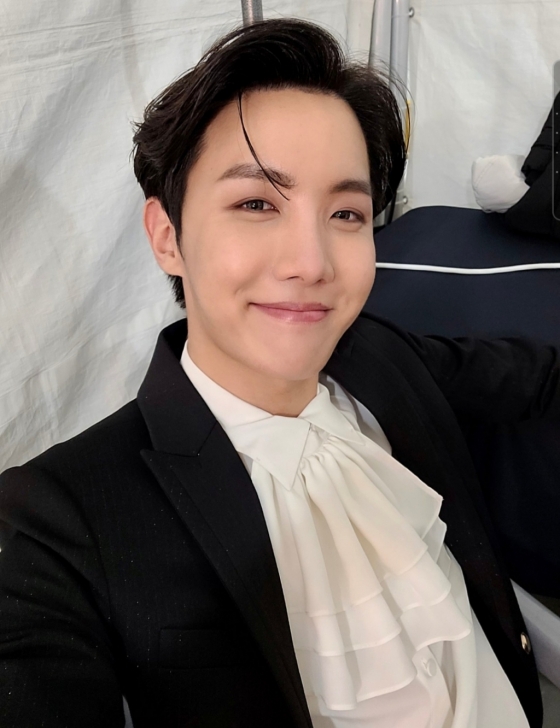또 다른 사진에는 블랙엔화이트 무대의상을 입고 있는 제이홉의 셀카가 담겼다. 먼저 마스크를 낀 채 사진을 찍은 제이홉은 다음 사진에서 마스크를 벗고 싱그러운 미소를 지은 채 카메라를 응시하고 있어 눈길을 끈다.