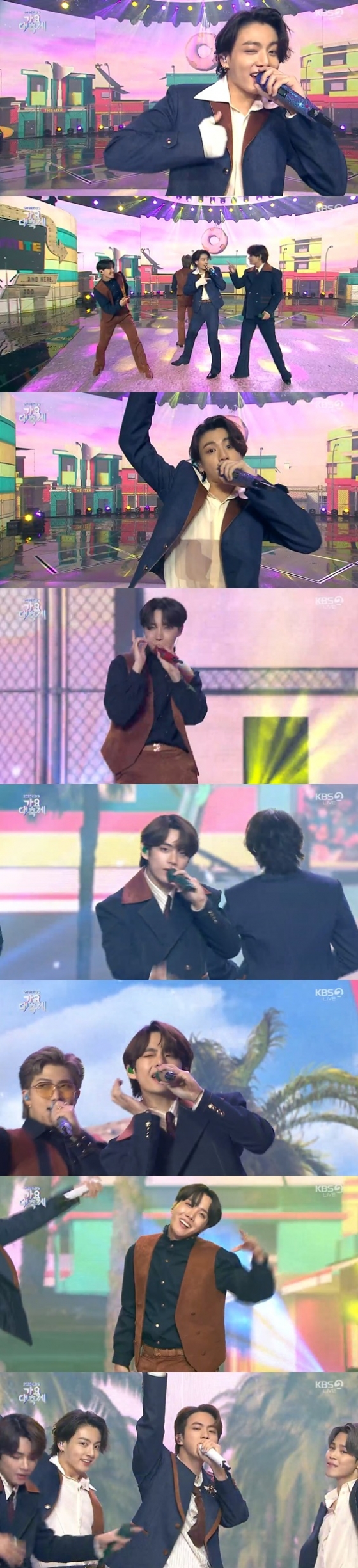 가장 관심을 끈 것은 월드스타 방탄소년단의 무대였다. 이날 방탄소년단의 무대에는 어깨 수술로 함께 하지 못한 슈가를 제외한 멤버들이 함께 했다.