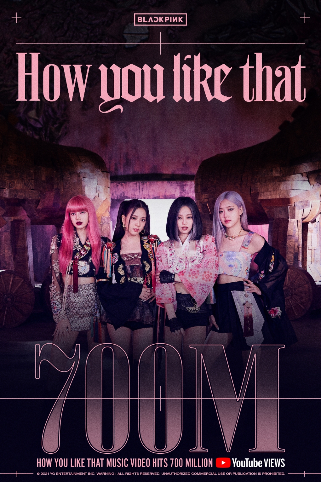 그룹 블랙핑크의 'How You Like That' 뮤직비디오가 7억뷰를 돌파했다. 블랙핑크 통산 5번째 7억대 뷰 영상이자 자체 최단 시간 기록을 경신하는 기염을 토했다.