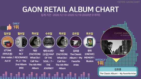 한편, 51주차(2020.12.13~2020.12.19) 일간 리테일 앨범차트에서는 13일 IZ*ONE (아이즈원) 'One-reeler / Act IV', 14일 NCT 'NCT RESONANCE Pt. 2 - The 2nd Album (Kit)', 15일 태연 (TAEYEON) 'What Do I Call You - The 4th Mini Album', 16일 방탄소년단 [수입] MAP OF THE SOUL : 7 ~ THE JOURNEY, 17일 태연 (TAEYEON) 'What Do I Call You - The 4th Mini Album', 18일 김호중 'The Classic Album I - My Favorite Arias', 19일 원위 (ONEWE) 'MEMORY : illusion'이 1위에 랭크됐다.