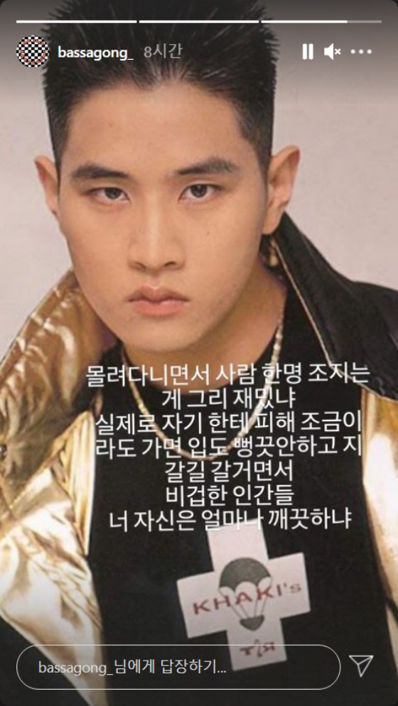 뱃사공은 22일 자신의 인스타그램 스토리에 유승준의 사진과 함께 "몰려다니면서 사람 한 명 XX는 게 그리 재밌냐"는 글을 게재했다.