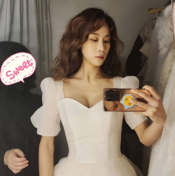 그룹 쥬얼리 출신 조민아가 웨딩드레스 자태를 공개했다.