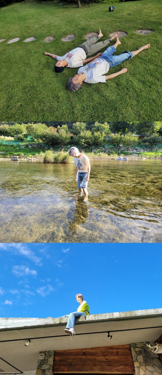 공개된 사진 속 지민은 잔디밭에 누워 편안한 표정을 짓고 있다. 또 계곡 속에 들어가 환한 표정을 짓거나, 푸른 하늘을 배경으로 삼은 청량한 사진을 공개했다.