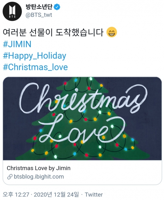 한편 지민은 '크리스마스 러브' 공개와 동시 방탄소년단 공식 블로그에 "여러분 모두는 사랑받아 마땅한 사람"이라며 "모두가 행복했으면 좋겠다는 소망을 담았다"고 밝혀 전 세계 팬들에게 깊은 감동을 선사했다.
