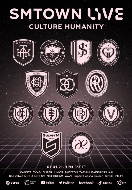 28일 오전 SM엔터테인먼트는 이 같은 사실을 공식 발표했다. SM엔터테먼트에 따르면 1월 1일 오후 1시(한국시간 기준)부터 공개될 'SMTOWN LIVE Culture Humanity'(에스엠타운 라이브 '컬처 휴머니티')는 네이버 V LIVE의 Beyond LIVE 채널을 비롯한 유튜브, 트위터, 페이스북, 틱톡, 일본 KNTV 등 각종 플랫폼을 통해 중계, 전 세계 팬들에게 무료로 공개된다.