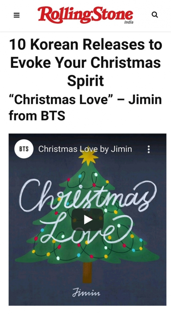 지민의 '크리스마스 러브'가 공개된 지난 24일 '롤링스톤 인디아'(RollingStone India)는 '크리스마스 기분을 끌어 올리는 한국 발매 곡 10가지'라는 제목의 기사에서 지민의 '크리스마스 러브'를 꼽으며 "방탄 소년단 지민이 크리스마스를 기념하는 노래로 팬들을 놀라게했다"고 전했다.