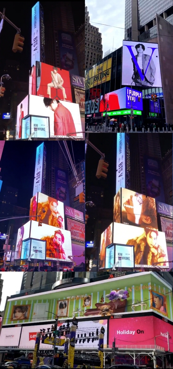세계의 심장부라고 할 수 있는 미국의 뉴욕의 타임스스퀘어(TIMES SQUARE)에는 뷔의 생일을 축하하는 영상과 메시지로 물들었다.