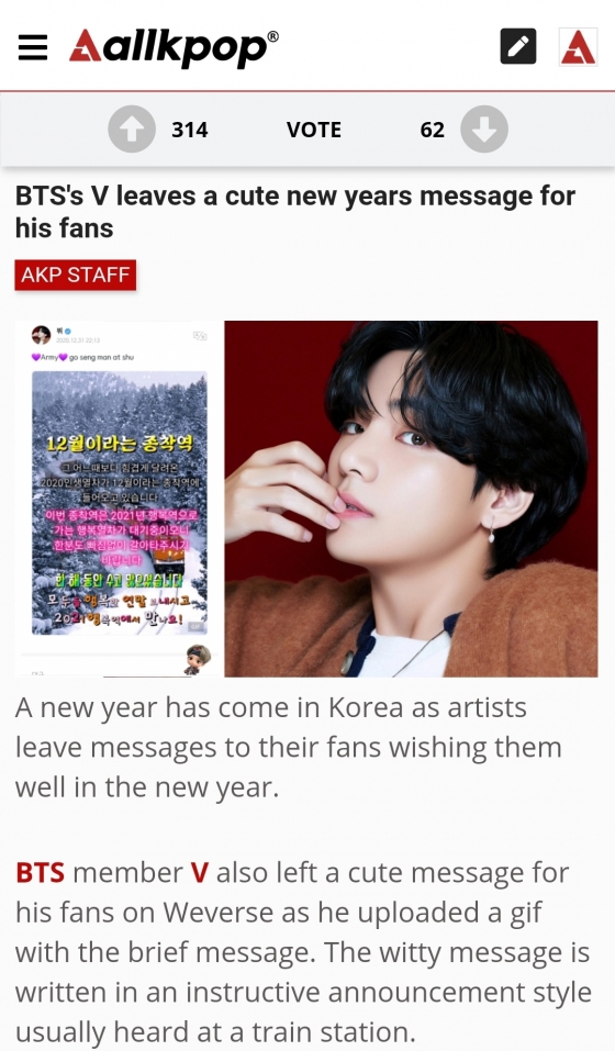 지난 12월 31일에는 '뷔가 팬들에게 귀여운 새해 메시지를 남겼다'는 제목의 기사가 해외 매체 ‘allkpop’(올케이팝)을 통해 보도됐다. "12월이라는 종착역. 이번 종착역은 2021년 행복역으로 가는 행복 열차가 대기 중이오니 한 분도 빠짐없이 갈아타 주시기 바랍니다"라는 재치 있는 문구가 있는 움직이는 그림을 뷔가 위버스에 게재한 것을 주목한 것이다.