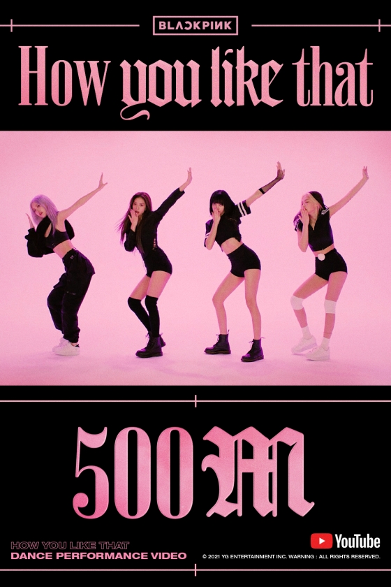 블랙핑크(BLACKPINK·지수, 제니,로제,리사)의 'How You Like That' 안무영상이 유튜브에서 5억뷰를 돌파했다. 뮤직비디오도 달성하기 쉽지 않은 조회수이자 안무영상으로써 단연 독보적 기록이다.