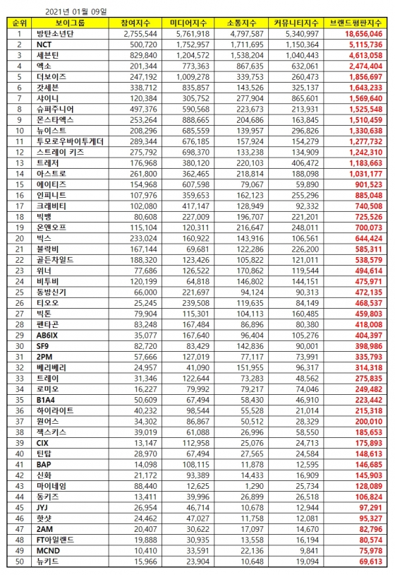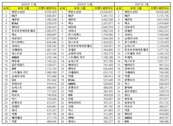 9일 한국기업평판연구소에 따르면 2021년 1월 보이그룹 브랜드평판 30위 순위는 1위 방탄소년단, 2위 NCT, 3위 세븐틴 순으로 분석됐다.