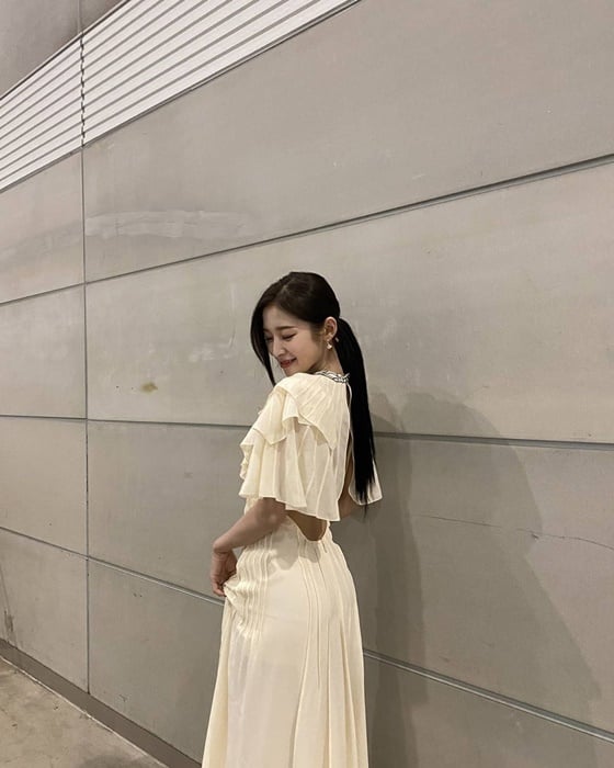 공개된 사진 속 아린은 흰색 드레스를 입고 수줍게 웃으며 바닥을 응시하고 있다. 아린은 긴 머리를 아래로 내려묶고 청순한 미모를 자랑했다.
