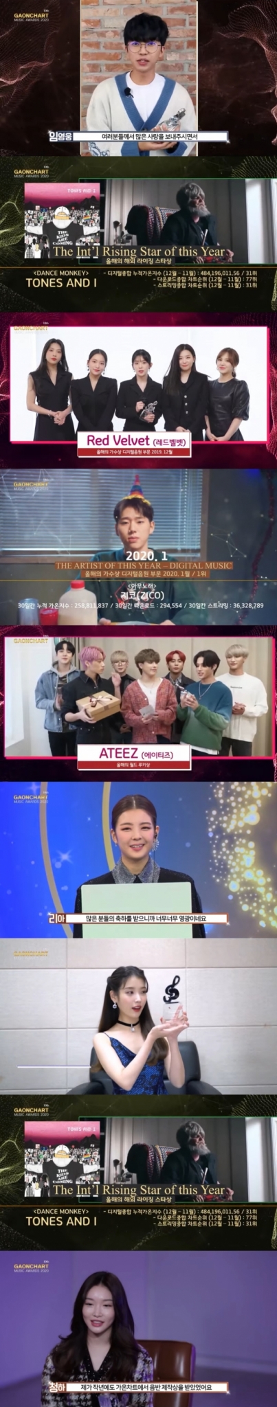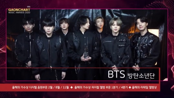 7일 온라인을 통해 방송된 제10회 가온차트 뮤직어워드에서 이날 방송은 슈퍼주니어 이특과 ITZY 리아의 진행으로 방송됐다. 방탄소년단은 총 음원, 앨범 부문 총 6관왕을 차지하며 2020년 최고의 활약을 보인 가수임을 다시금 입증해냈다.
