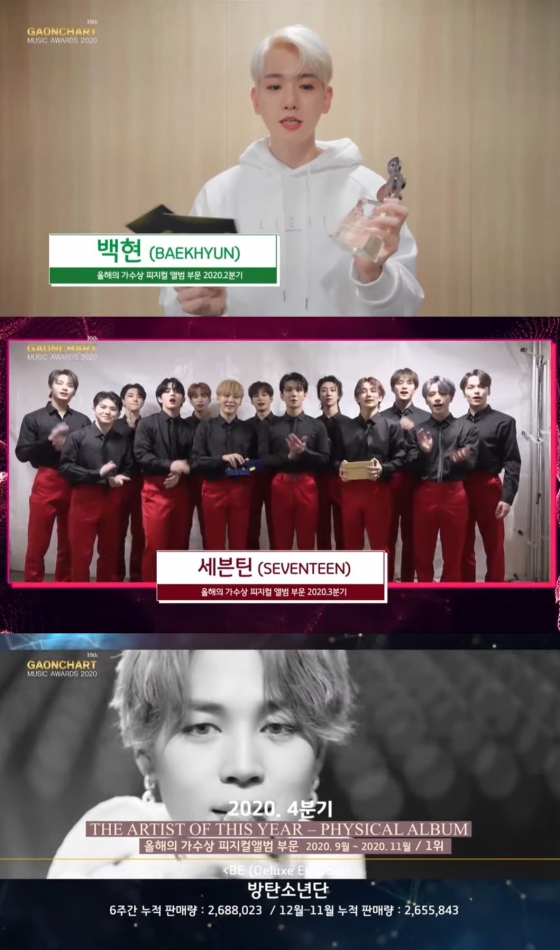 올해의 가수상 2019년 12월~2020년 2월 피지컬 앨범 부문 수상자는 방탄소년단 MAP OF THE SOUL:7, 2020년 3월~2020년 5월 백현 '딜라이트', 2020년 6월~2020년 8월 세븐틴 '헹가래', 2020년 9월~2020년 11월 방탄소년단 'BE'가 나란히 차지했다.