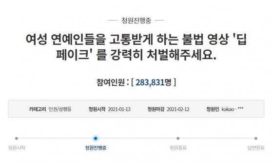 한 네티즌은 지난 12일 청와대 국민청원 게시판을 통해 '여성 연예인들을 고통 받게 하는 불법 영상 딥페이크를 강력히 처벌해달라'는 청원을 게재했다. 이 청원 글은 13일 오후 6시 20분 현재 26만 5000명 이상의 동의를 얻으면서 청와대 답변 요건을 갖췄다.