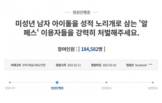이미 앞서 래퍼 손심바의 공론화로도 잘 알려졌던 알페스 역시 국민청원을 통해뜨거운 이슈로 자리를 잡았다. "미성년 남자 아이돌을 성적 노리개로 삼는 '알페스' 이용자들을 강력히 처벌해주세요"라는 제목의 청원 글도 게재돼 18만 동의를 넘어서며 20만 동의에 근접해 있다.