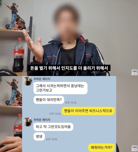 실제 A씨는 한 아이돌과 대화한 내용이라며 카카오톡 메시지를 공개했다. 대화 속 아이돌로 추정되는 남성은 "비즈니스 동성애 커플이 많다. 팬들이 이어준다"며 "꽁냥대는 걸 보면서 팬들이 대리만족을 한다"고 말했다.