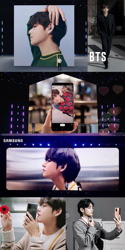 언팩 행사를 시작하기 전 삼성모바일은 방탄소년단과 함께한 홍보 포스터를 공개했는데, 올 블랙 수트를 입고 시크하게 걷는 뷔의 모습은 런웨이를 걷는 모델같은 포스를 자아냈다. 특히 조도가 낮은 어두운 공간이었음에도 불구하고 뷔의 뚜렷한 이목구비로 인해 조형미가 더욱 빛을 발했다.