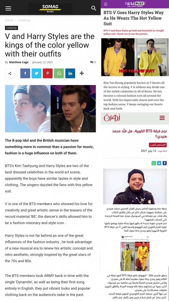 뷔의 파격적인 의상 선택은 해외 매체의 관심을 받기도 했다. 온라인 매체 '소매그', 'IWMbuzz'는 영국의 팝스타 겸 배우 '해리 스타일스'가 착용했던 노란색 슈트와 뷔의 패션의 유사성에 주목해 두 패셔니스타의 행보에도 관심을 보였다. 또 이집트의 유명 코미디언 겸 배우 모하메드 헤네디(Mohammed Henedy)도 자신이 입었던 의상과 비슷하다며 뷔에게 큰 관심을 보였다.
