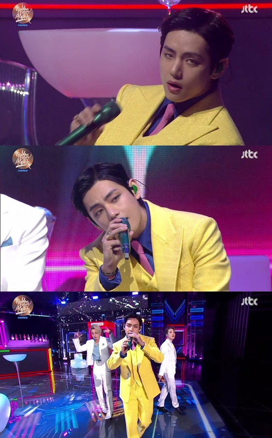 다채로운 무대 역시 펼쳐진 가운데 뷔는 '다이너마이트'(Dynamite) 슬로우 잼 버전 무대에서 다소 파격적인 화려한 노란색 슈트를 선보였다.