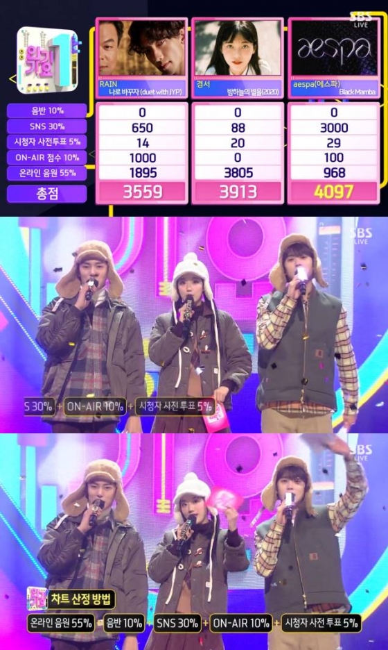 17일 오후 방송된 SBS 음악 프로그램 '인기가요'에서는 에스파 '블랙 맘바'(Black Mamba)가 비(RAIN) '나로 바꾸자'(duet with JYP), 경서 '밤하늘의 별을(2020)'을 제치고 1월 셋째 주 1위를 차지했다.