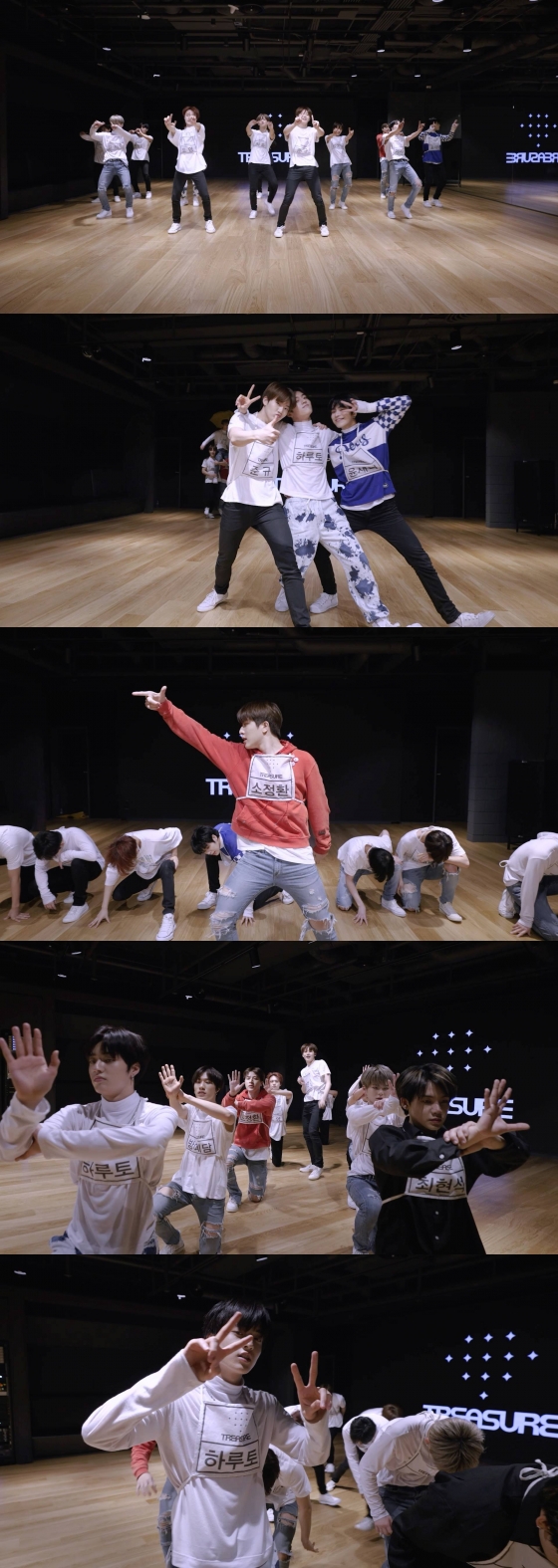 YG 대형 신인 트레저(TREASURE·최현석, 지훈, 요시, 준규, 마시호, 윤재혁, 아사히, 방예담, 도영, 하루토, 박정우, 소정환)의 정규 1집 타이틀곡 'MY TREASURE' 안무 연습 영상이 19일 공개됐다.