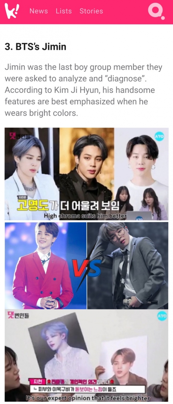 이에 북미 매체 ‘코리아부(koreaboo)’는 '광개토 팔레트', '톤 파괴자'로 불리며 헤어, 착장 등으로 매번 글로벌 팬들의 뜨거운 관심을 불러일으키는 지민의 퍼스널 컬러에 대해 전했다.