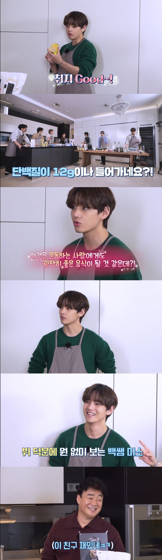 백종원을 "한국 모든 요리를 책임지시는 아버지"라고 소개한 뷔는 백종원의 요리 코칭을 그대로 따라 하며 그를 향한 애정공세를 펼쳤다.