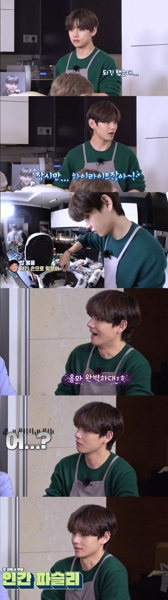 평소 데코 담당으로 '요리는 데코다'라는 철학을 가진 뷔는 햄 위에도 파슬리를 신중하게 뿌리며 데코를 완성해 팬들을 미소 짓게 하기도 했다. 요리 중에서는 밥을 담당했던 뷔는 취사가 끝난 밥솥을 열기 전 밥에서 김이 나는 것이 퍼포먼스라며 깨알 같은 잔망미를 보여주기도 했다.