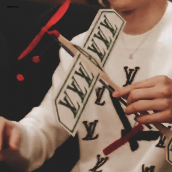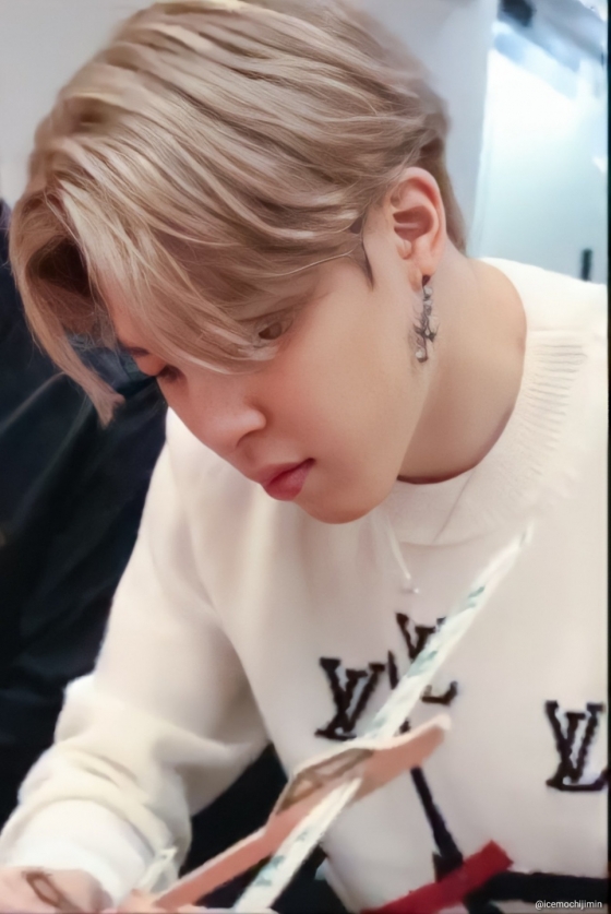 깨끗하고 하얀 피부, 금발의 지민은 시크한 도시남 이미지와 포근한 느낌의 니트가 최상의 조화를 이루며 지민만의 고급스러움을 자아내, 루이 비통의 대표적인 로고와 함께 정식 모델을 방불케 했다.