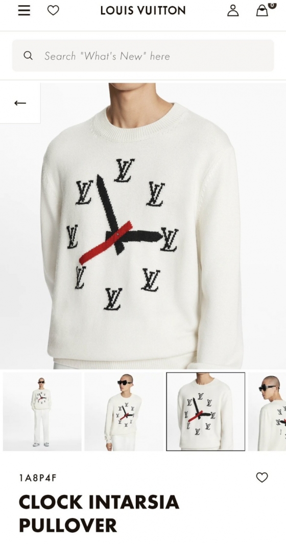 지민은 영상에서 루이 비통의 대표 시그니처인 LV 로고가 시계 이미지로 디자인된 화이트 색상의 니트를 착용, 눈길을 사로잡았다.