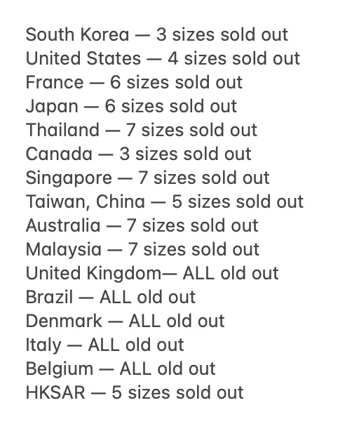 이탈리아, 프랑스, 호주, 일본 등 16개국 이상에서 품절 현상을 보이고 있으며 7개 전 사이즈가 품절된 국가도 다수다.