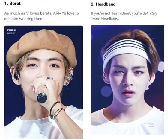 최근 해외매체 코리아부는 '베레모'와 '헤어밴드'를 착용한 뷔의 사진을 게재하며 베스트 아이템에 주목했다.