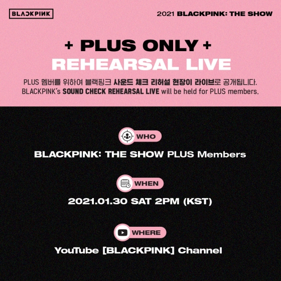 22일 블랙핑크 공식 SNS에는 'BLACKPINK: THE SHOW' 채널 멤버십 추가 혜택인 '리허설 이벤트' 관련 공지가 게재됐다. 안내에 따르면 'BLACKPINK: THE SHOW' 공연 하루 전날인 30일 오후 2시(한국시간) 블랙핑크의 사운드 체크 리허설 현장이 실시간으로 공개된다.