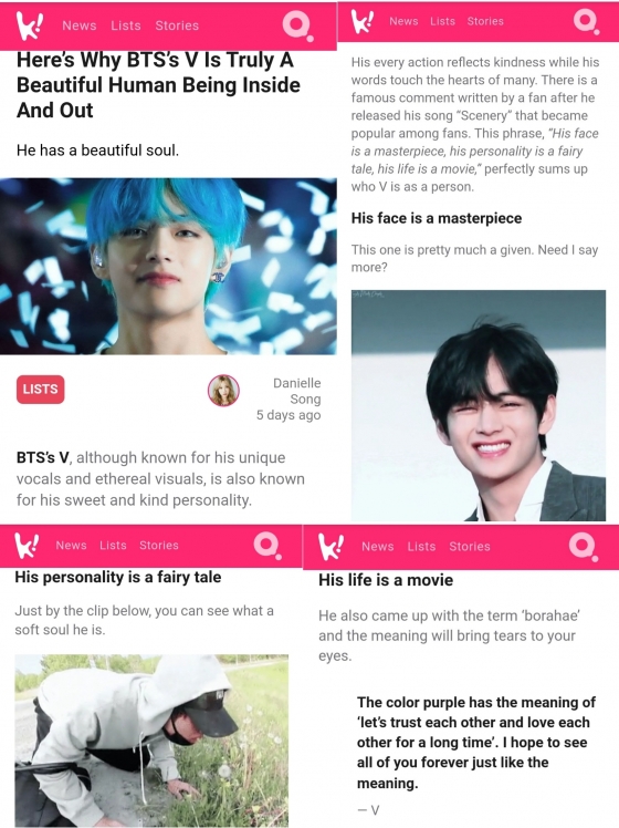 뷔가 만든 '보라해'(I purple you)라는 말은 전 세계에서 통용되는 말이 됐고, 뉴욕 엠파이어스테이트빌딩, 런던 웸블리 스타디움, 파리 스타드 드 프랑스스타디움 등 각국의 랜드 마크들이 모두 보랏빛 조명으로 방탄소년단에게 환영인사를 보내기도 했다.