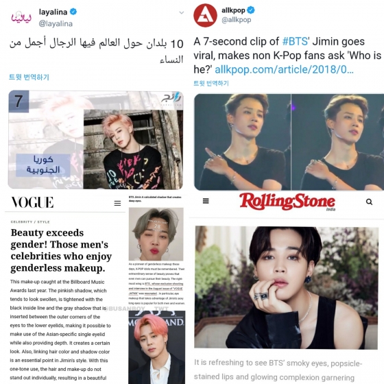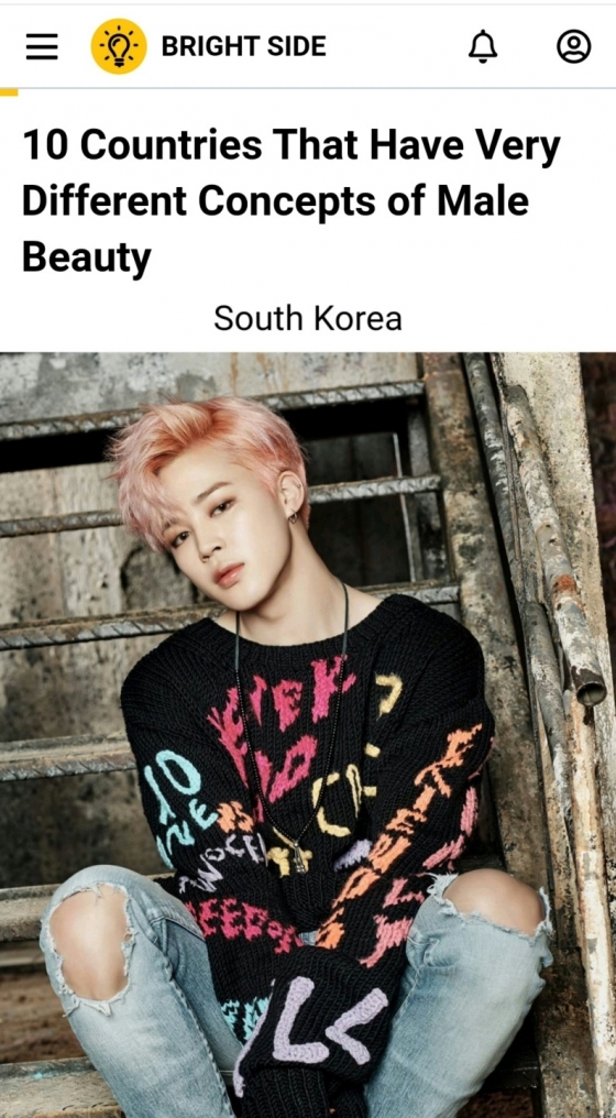 중동 최초의 패션, 뷰티, 셀럽, 라이프 스타일 전문 아랍매체 '라얄리나'(Layalina)는 지난 23일 공식 SNS 계정에 '세계 10개국의 여자보다 아름다운 남자'에 단 한 명의 한국 대표로 지민을 선정했다.