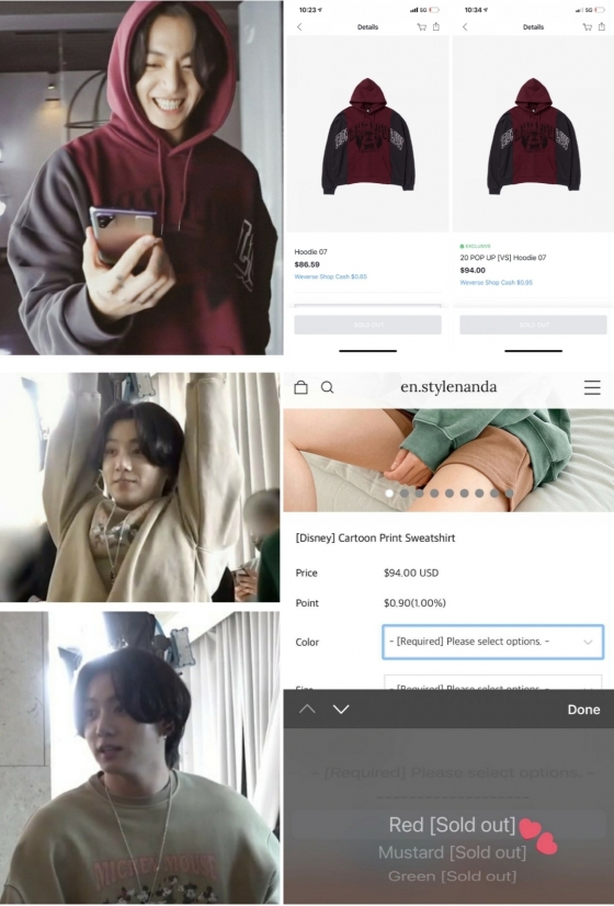 이와 함께 21일 방탄소년단 자체 예능 프로그램 '달려라 방탄' 125회 BTSX백종원 'K-햄 특집' 비하인드 영상이 공개된 몇 시간 후 정국이 입은 머스터드 컬러 디즈니 맨투맨티가 '스타일난다' 공식 쇼핑몰에서 일시 품절되기도 했다.