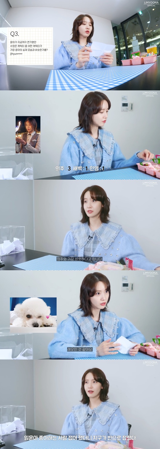 요즘 가장 설레게 하는 것으로는 반려견 '레오'를 꼽았다. 윤아는 "안 보면 보고 싶다"며 애정을 표현했다. 이어 가장 큰 인상을 남긴 주접멘트로는 "임윤아 좋아하는 사람 접어, 했더니 지구가 반이 접혔다"고 답했다.