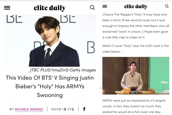 이어 "뷔의 천사 같은 보컬에 감명받은 아미들은 언제가 뷔가 노래 전체의 커버곡을 올려 주기를 바라고 있다"고 덧붙였다.
