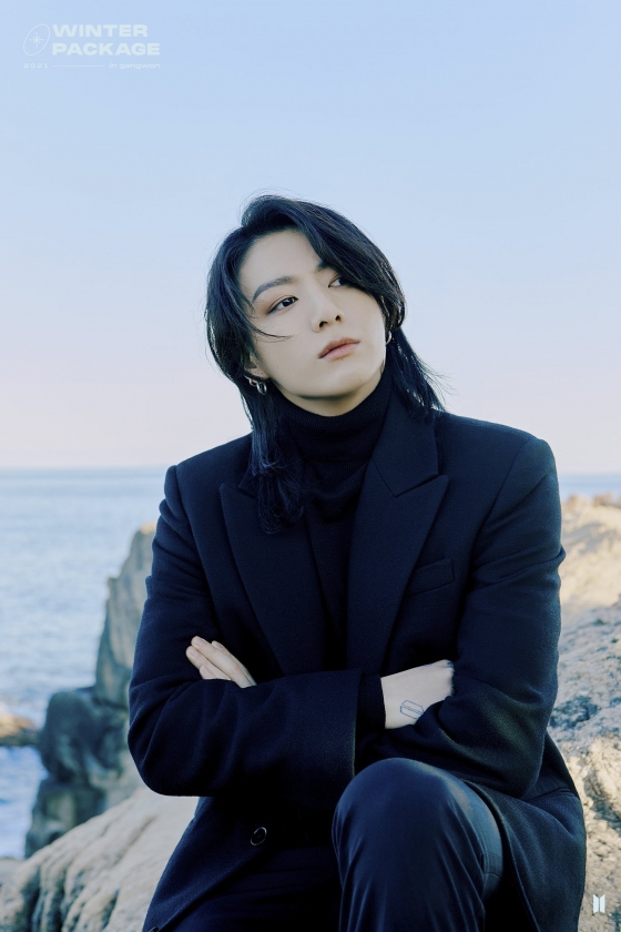 정국은 바다가 펼쳐진 바위에 앉아 어딘 가를 응시하며 오묘하고 신비스러움을 가득 풍겨 눈길을 끌었다.