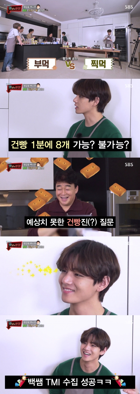 갑자기 시작한 밸런스 게임에서 뷔는 "탕수육 부먹 vs 찍먹?", "건빵 1분에 8개 가능 vs 불가능?" 등의 허를 찌르는 질문을 해 백종원뿐 아니라 현장 스태프들까지도 웃음바다로 만들었다. 방송 화면에는 '예상치 못한 건빵진(?) 질문', '백쌤 TMI 수집 성공 ㅋㅋ'이라는 자막을 더해 웃음을 안겼다.