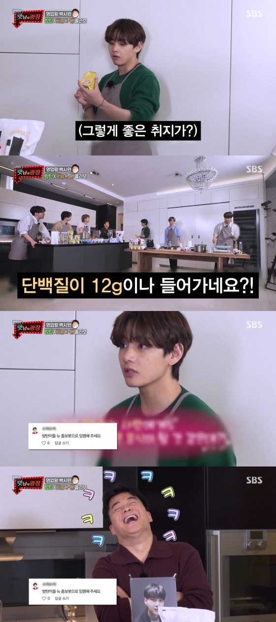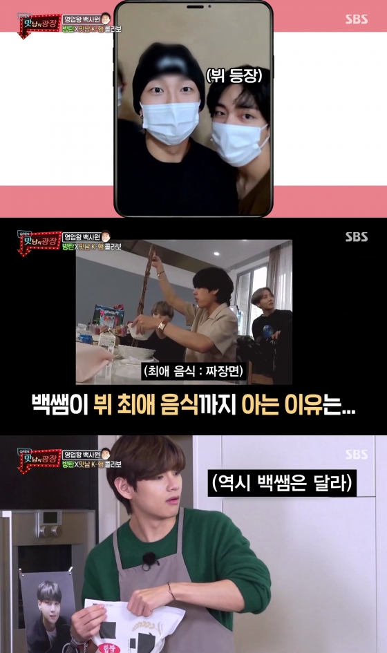 뷔는 "선생님"하고 조심스럽게 백종원을 부르더니 "저희 엄마가 요리를 선생님 보고 배웠다는데, 혹시 끝나고 사인 한 장만 해주실 수 있습니까?"라는 귀여운 부탁을 했고, 백종원의 눈에서는 꿀이 떨어지는 듯한 사랑스러움이 느껴졌다.