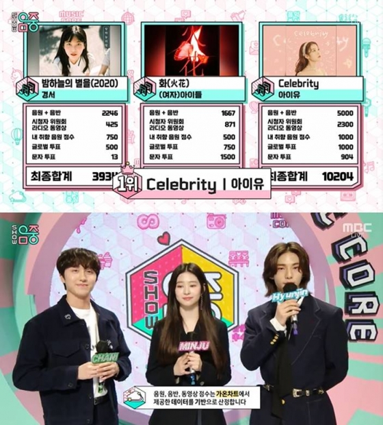 6일 오후 방송된 MBC 음악 프로그램 '쇼! 음악중심'(이하 '음중')에서는 아이유가 1위를 차지했다. 이날 2월 1주차 1위 후보로 경서 '밤하늘의 별을', (여자)아이들 '화'(火花), 아이유 'Celebrity'(셀러브리티)가 올랐다.