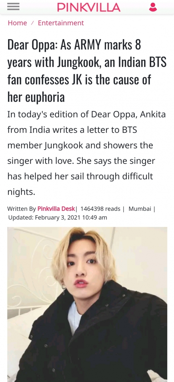 최근 인도 매체 '핑크빌라'(Pinkvilla)는 콜카타(Kolkata)에 사는 안키타(Ankita)라는 이름의 팬이 정국을 향한 사랑과 감탄을 고백하는 애달픈 편지를 썼다고 보도했다.