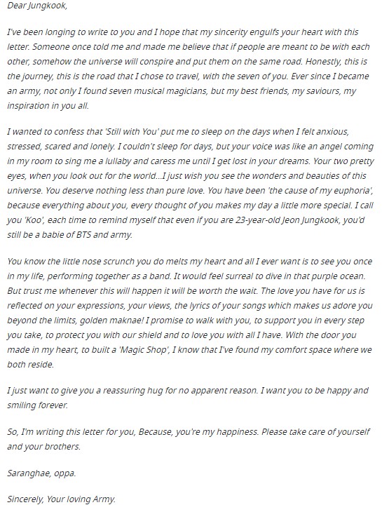 이어 "아미를 향한 사랑은 정국의 표정과 말 그리고 노래 가사에서도 다 녹아있어 그를 끝도 없이 사랑하게 만든다"며 정국과 함께 걸어가고 서포트하며 지키고 사랑하겠다는 다짐을 편지에 썼다.