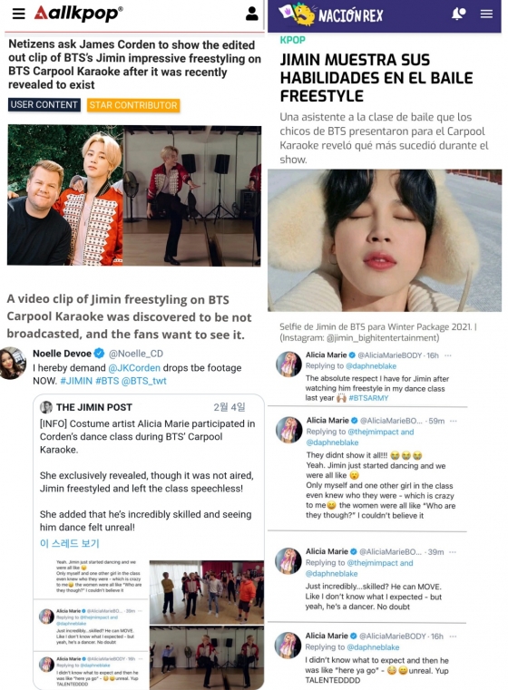 이에 북미 매체 '올케이팝'과 스페인 매체 '나시옹렉스'에서 "네티즌들은 최근 방탄소년단 카풀 노래방에서 방탄소년단 지민의 인상적인 프리스타일 댄스 편집 영상을 보여달라고 제임스 코든에게 요청하고 있다"고 소식을 전했다.