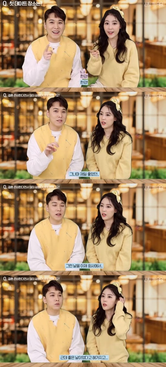 뮤지컬 '삼총사'에 함께 출연하며 처음 만난 두 사람은 첫 데이트 장소로 '한강'을 언급했다. 성민은 "사귀기 전에도 데이트라 할 수 있는 거지. 썸 단계였다"며 "날씨가 추운 날이었다. 한강 편의점에서 라면을 끓여서 차에 가지고 와서 먹었는데